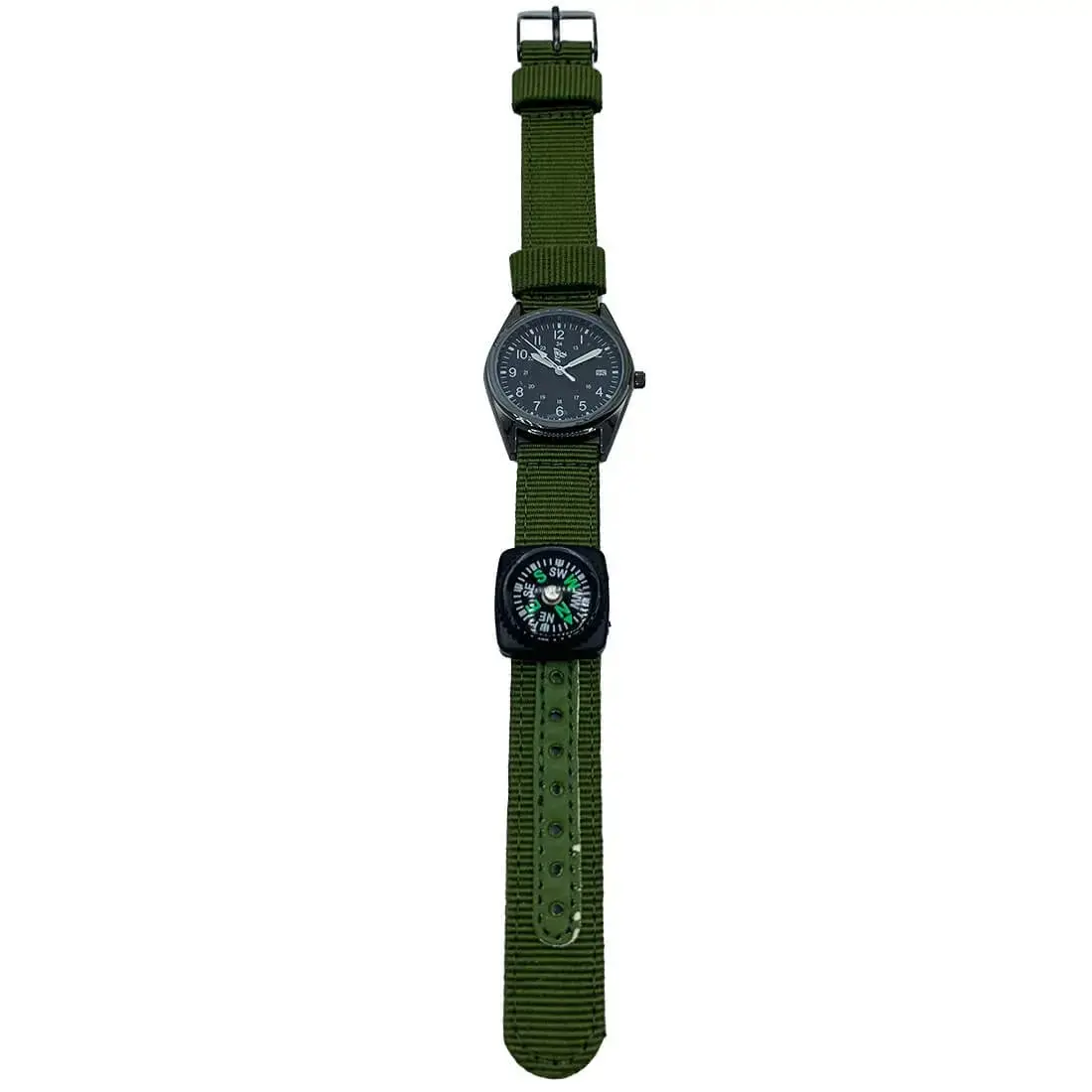 Analogue tactical watch with green nato wrist strap complete with mini-compass for clear and concise time and bearing. Complete with crown to adjust time in different zones, this also features a tough glass case essential for day to day wear and tear protection