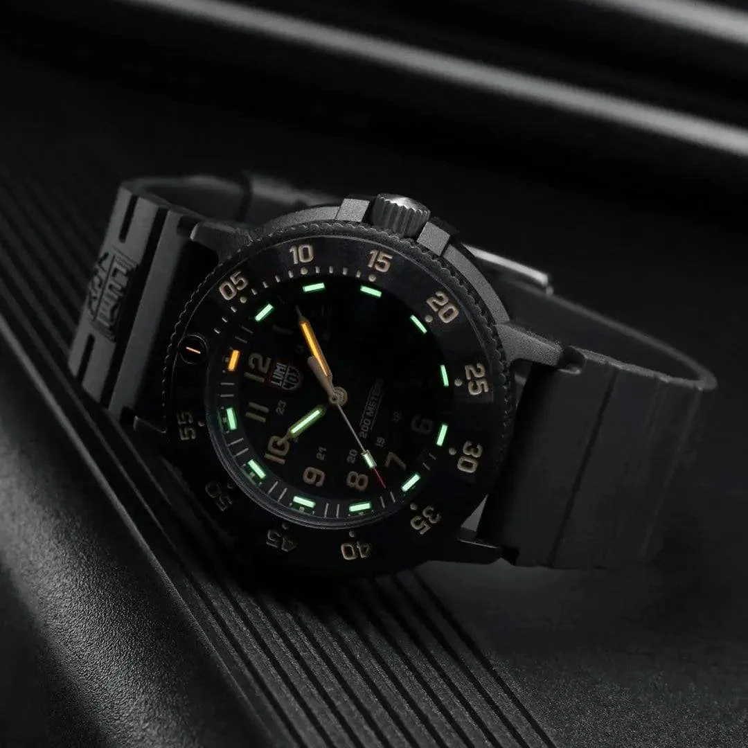 Powered by a Swiss-made quartz movement (RONDA 515), the Navy Seal 3000 Series watch guarantees precision. Luminox Light Technology (LLT) enables continuous visibility for up to 25 years, even in total darkness, thanks to its self-powered illumination system. This feature makes it indispensable for night missions or low-light environments. The unidirectional rotating bezel and screw-in crown add to its functionality, allowing divers to track time underwater securely.